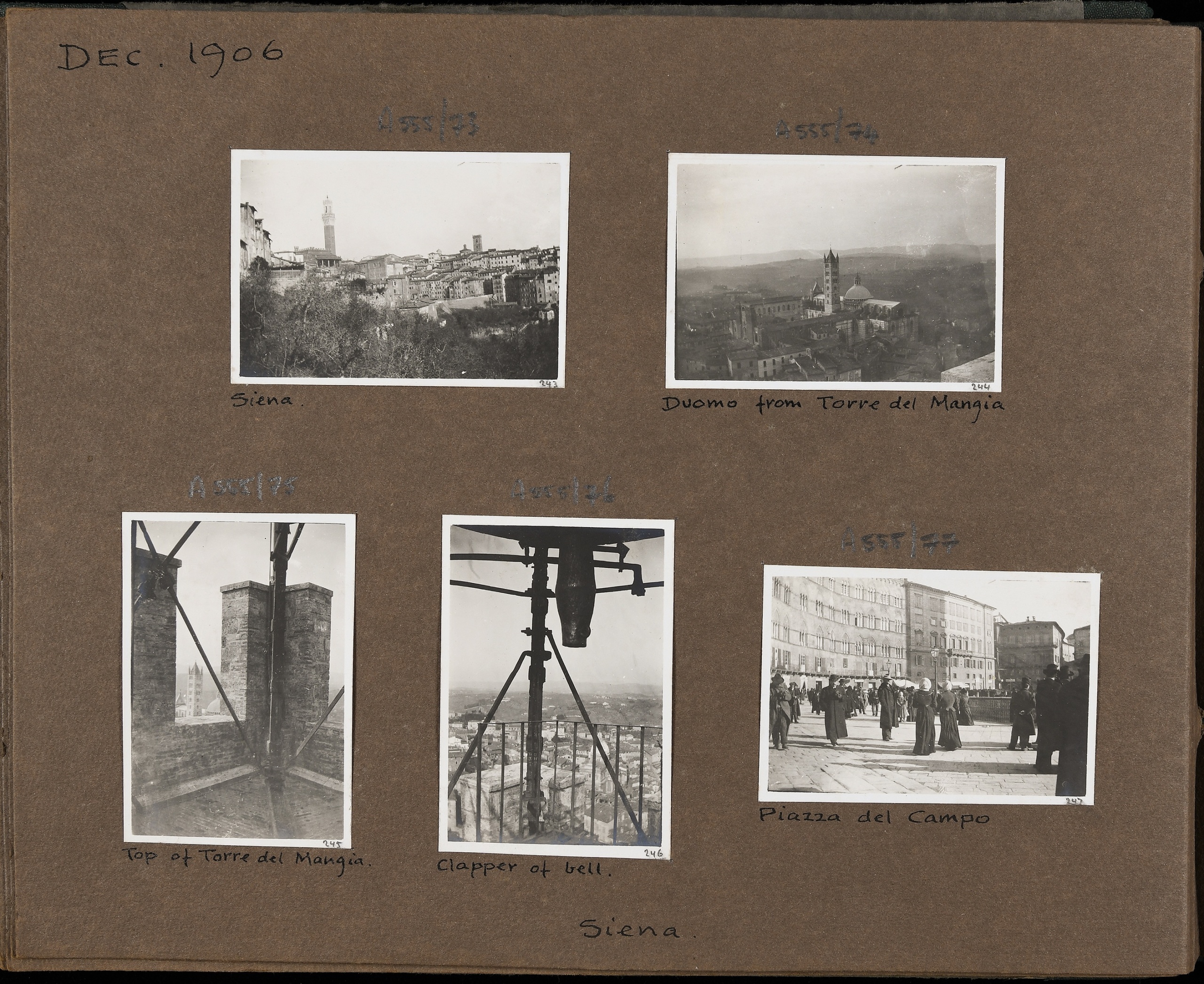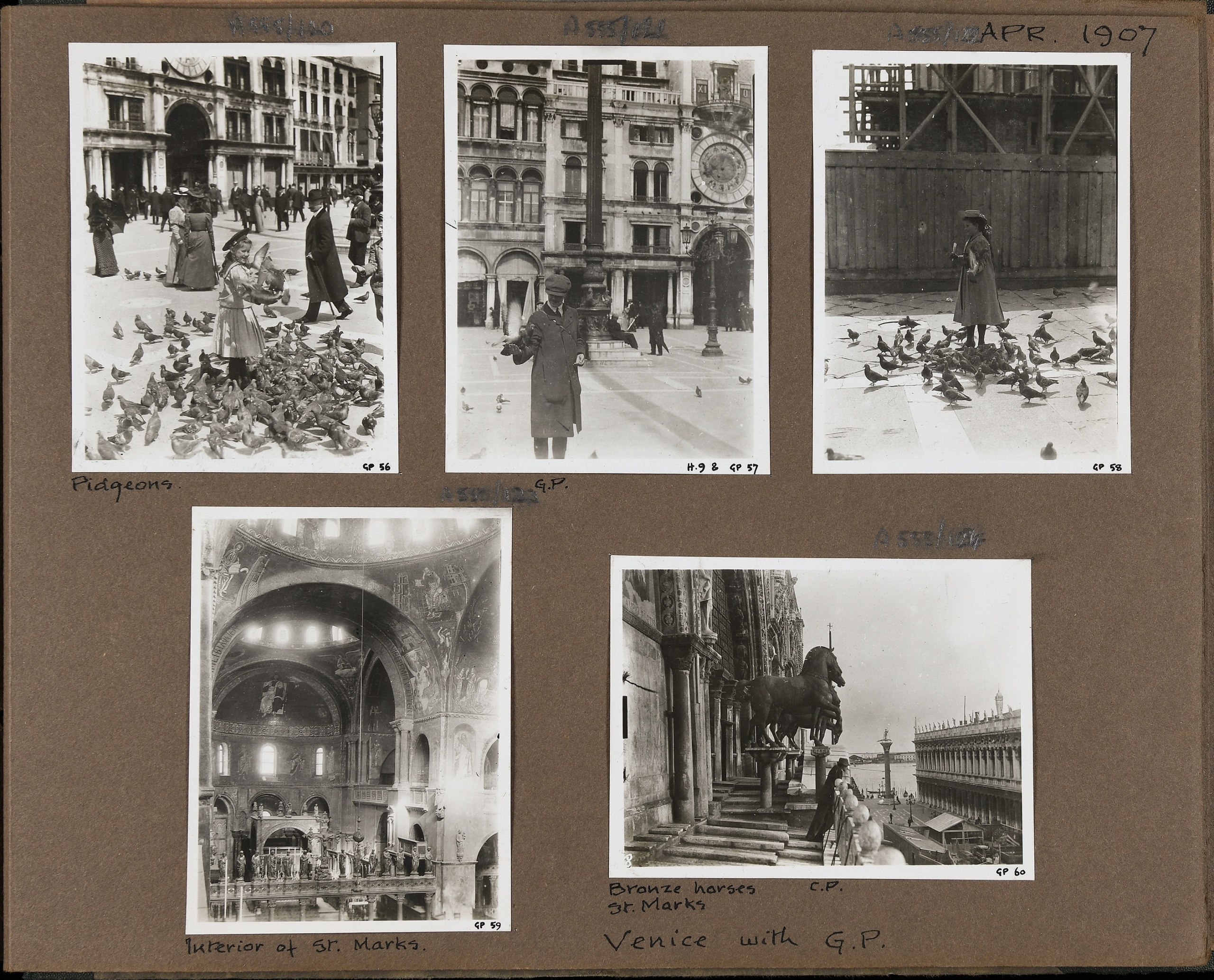 Infine, alcune pagine dell’album documentano il viaggio a Venezia con l’amato fratello Jerry. L’ultima fotografia, scattata dal fratello nell’aprile 1907, ritrae Pinsent sotto i cavalli di San Marco, mentre contempla la laguna e osserva con attenzione il grande cantiere allestito davanti alla basilica. Proprio in quegli anni, si stava infatti concludendo la ricostruzione del campanile, crollato tragicamente nel 1902 a seguito di un cedimento strutturale.