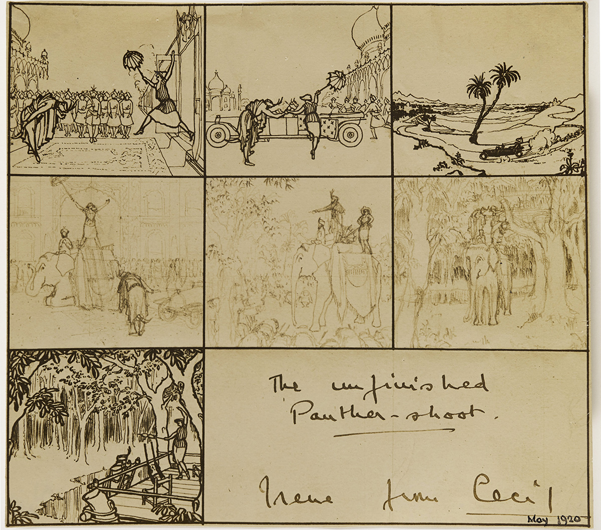 Irene, dal canto suo, gli scriveva dei suoi viaggi, come quello in India, nel maggio 1920. Cecil rispose alle lettere dell’amica con una serie di “disegni cinematografici”, in cui cercava di tradurre in immagini il suo racconto “vivido ed emozionante, per non dire, a volte, comico”. Nel biglietto che accompagnava le vignette, scrisse a Irene: “ti prometto che l’evento [che mi hai raccontato] sarà ancora più emozionante nei disegni di quanto non lo sia stato in realtà” (Hull, CP, 19 giugno 1920).