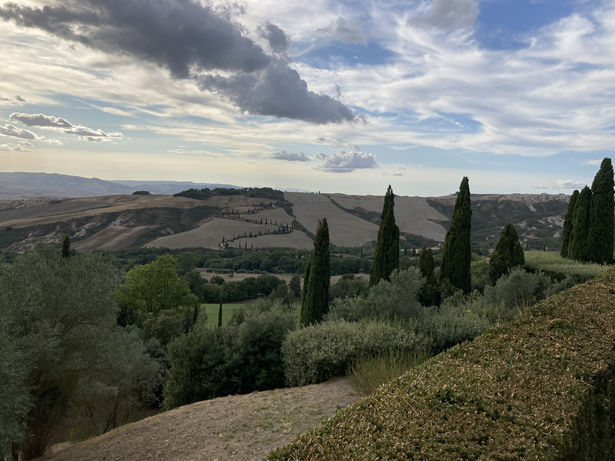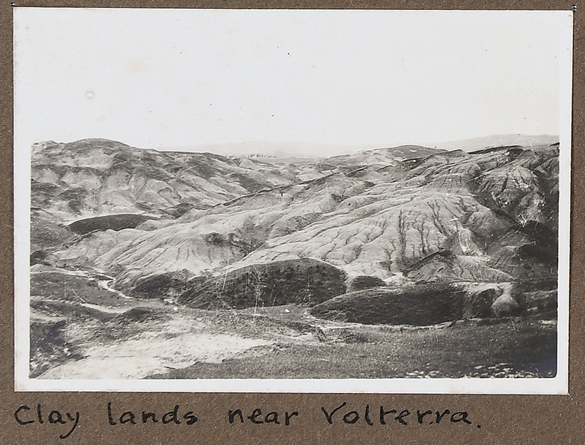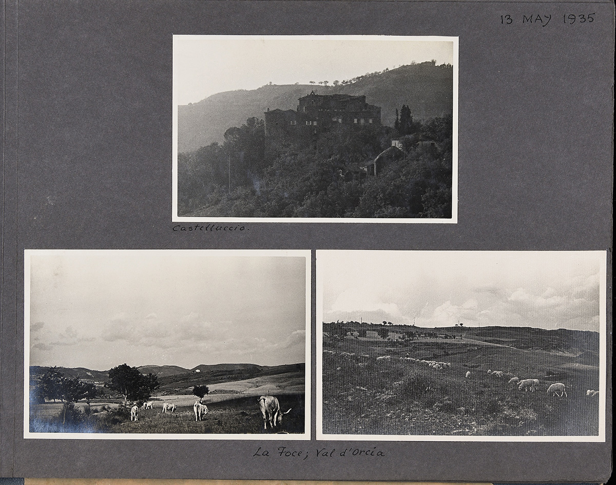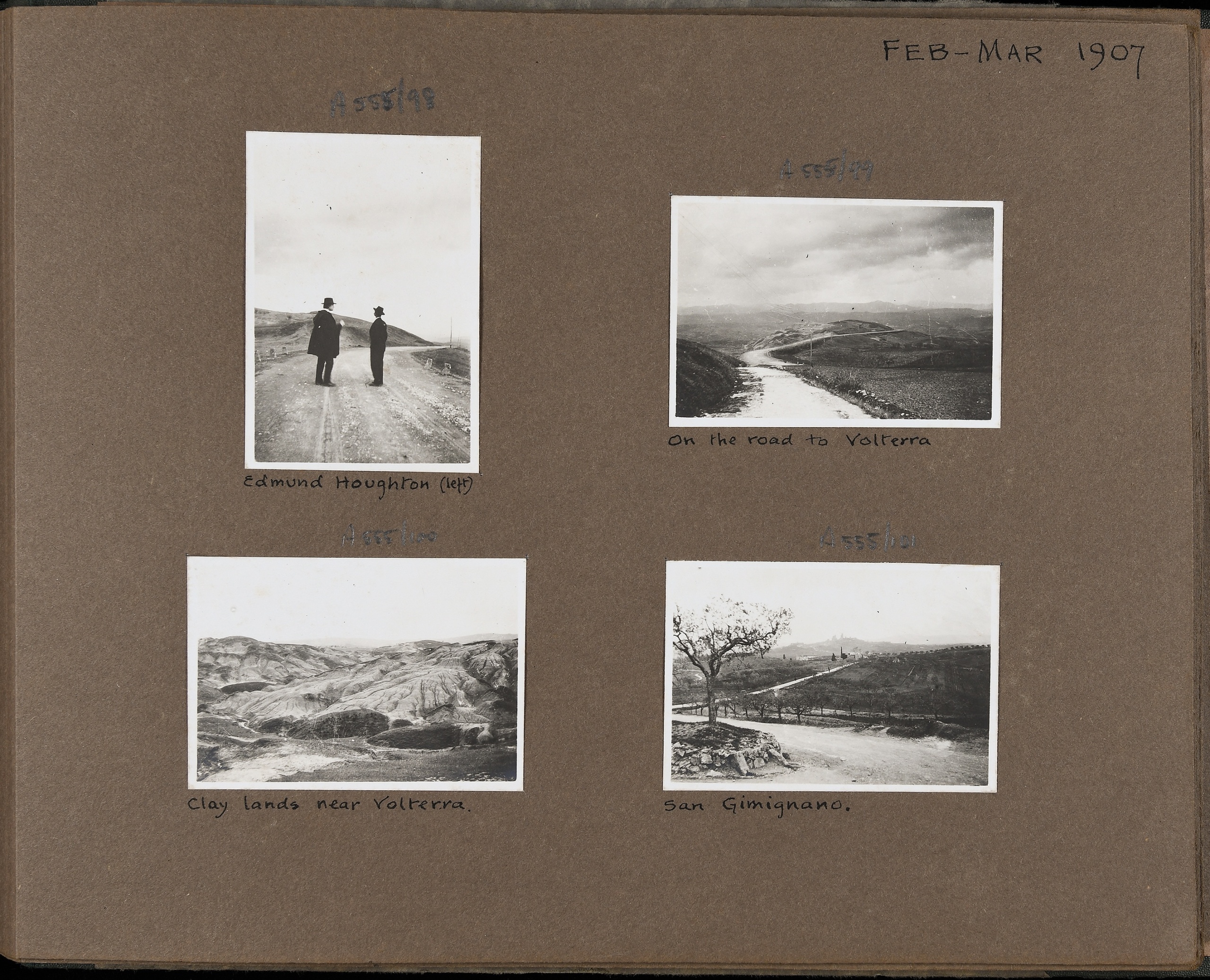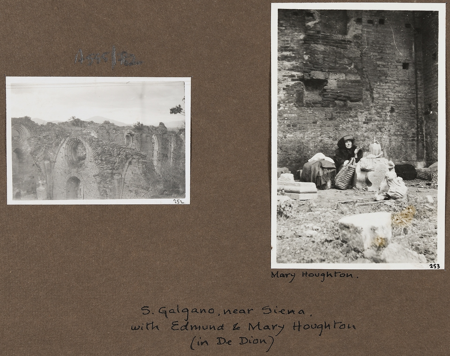 L’appartamento fiorentino degli Houghton era il punto di partenza per frequenti escursioni nella campagna toscana, rigorosamente in automobile. E, infatti, Cecil e gli Houghton intrapresero a bordo di una De Dion-Bouton diverse escursioni in terra senese, toccando San Galgano, Siena, le Alpi Apuane e Volterra. Alcune fotografie li raffigurano vestiti di tutto punto, il giorno di Natale, mentre brindano in riva al fiume Frigido, non lontano da Massa e Carrara. Altre, invece, raccontano il fascino che il paesaggio toscano esercitava sul giovane architetto e illustrano la città di Siena, vista dalla torre del Mangia, le crete senesi, le brulle campagne che circondano San Giminiano e le suggestive rovine dell’abbazia di San Galgano.