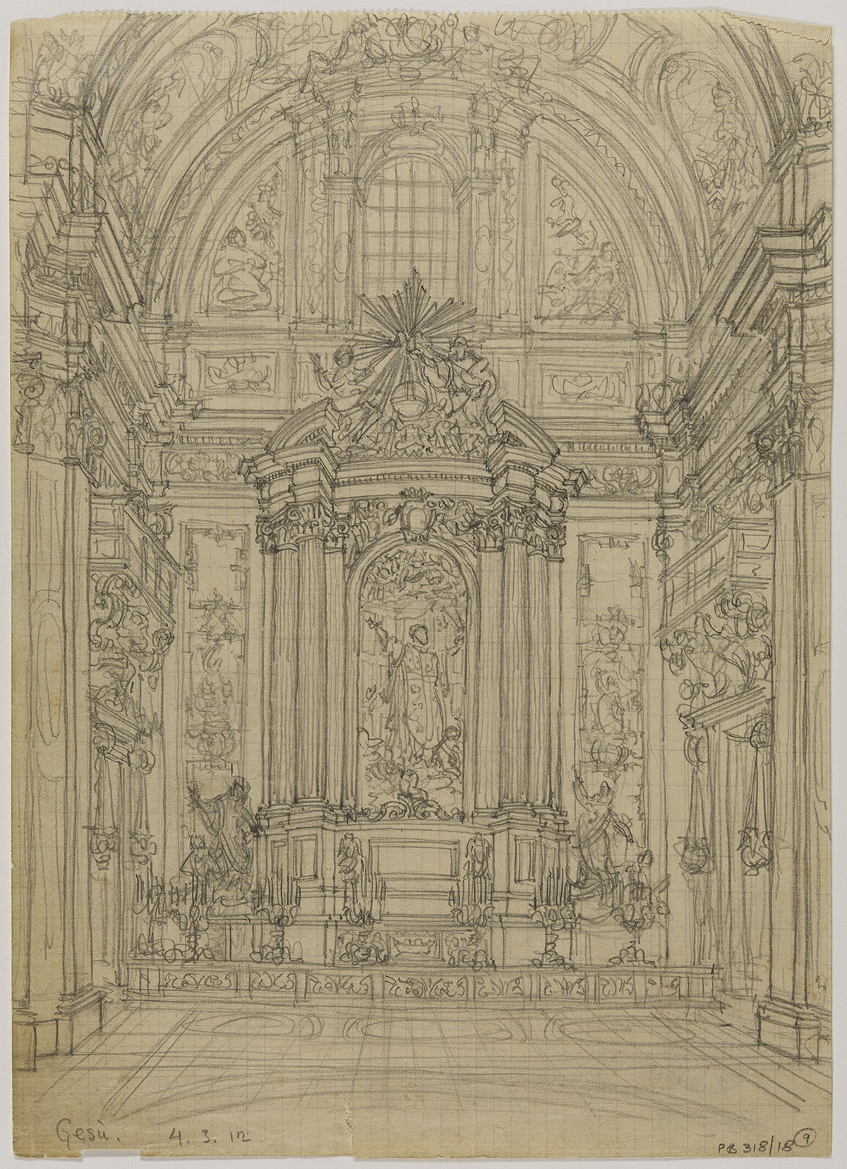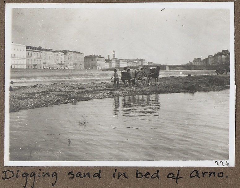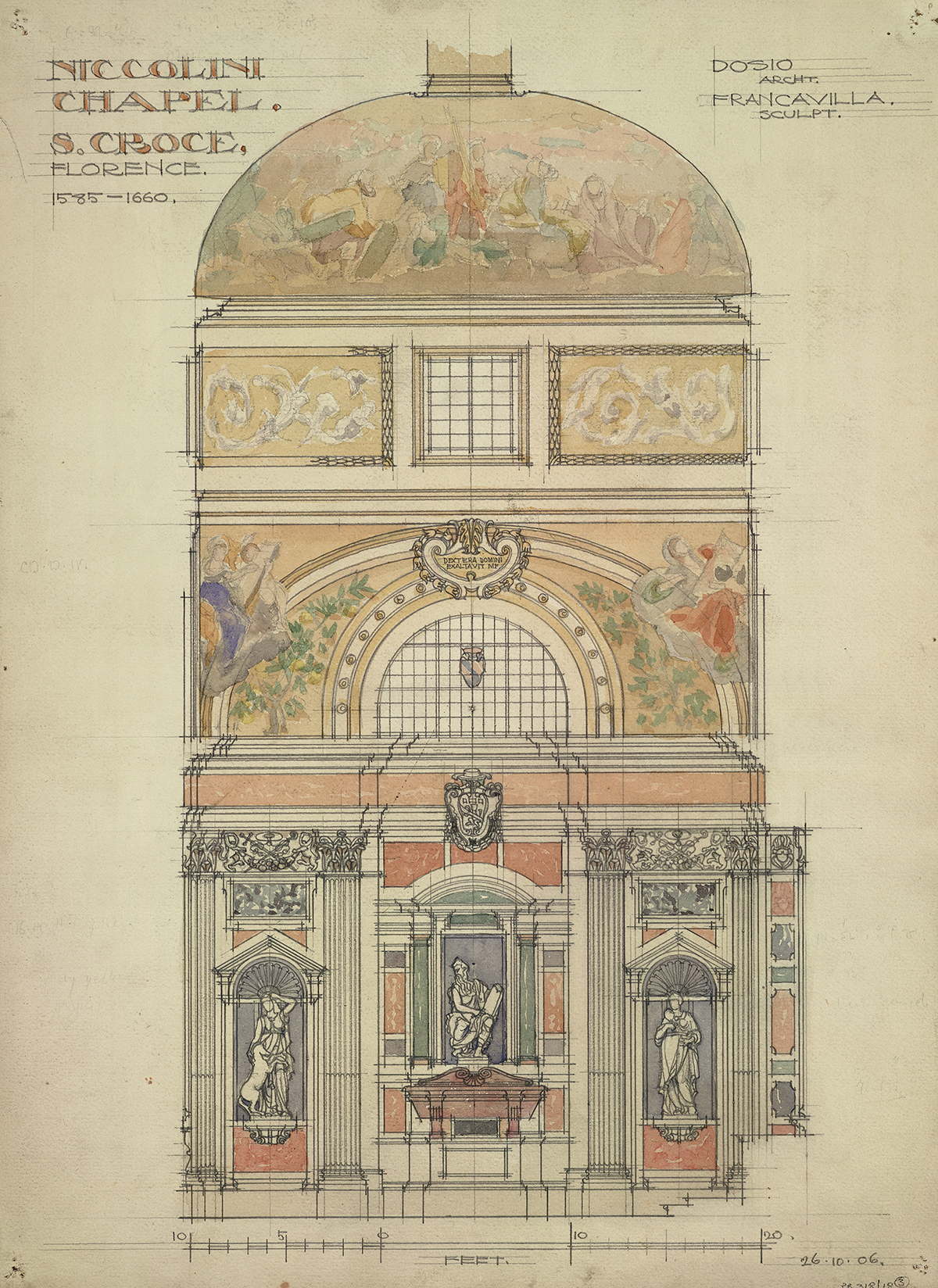 I primi giorni in Toscana furono per Cecil un’esperienza di scoperta continua. Fotografò i pittoreschi ‘renaioli’ sulle rive dell’Arno, i venditori ambulanti di Ponte alla Carraia e visitò i principali monumenti della città, tra cui il Duomo, la cui facciata neogotica era stata completata in stile soltanto pochi decenni prima. Come nei viaggi in Inghilterra e in Francia negli anni precedenti, anche il soggiorno fiorentino rappresentò un’occasione per esercitarsi nel disegno e per affinare, attraverso questa pratica, le competenze necessarie alla professione. Armato di compasso, carta, matita, penna e acquerelli, si soffermava su ciò che più lo colpiva: dal monumento sepolcrale di Carlo Marsuppini a Santa Croce, alla cappella cinquecentesca dei Niccolini nella stessa chiesa, fino al Palazzo Nonfinito e a elementi di arredi tardo barocchi, come il badalone della Badia fiorentina. Sebbene i soggetti fossero rappresentati con grande perizia tecnica, la loro selezione appare casuale e riflette l’indecisione tipica di un giovane ancora in cerca di una direzione. Cecil non aveva ancora maturato un gusto definito, né un’estetica coerente: tutto ciò che si discostava dalla sua quotidianità sembrava attrarlo e forse è proprio questa curiosità, un po’ onnivora, il filo conduttore delle sue esercitazioni fiorentine.