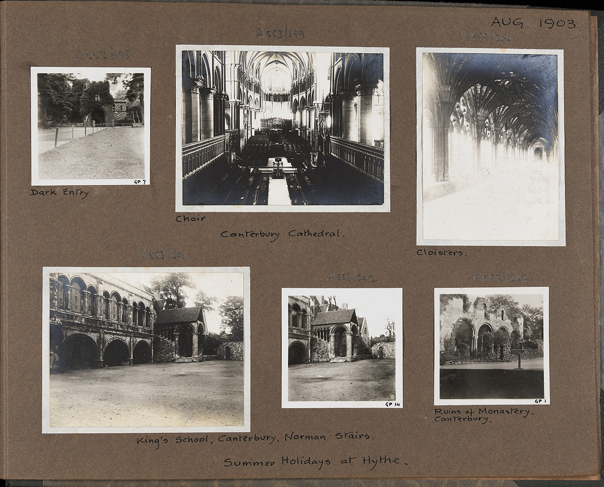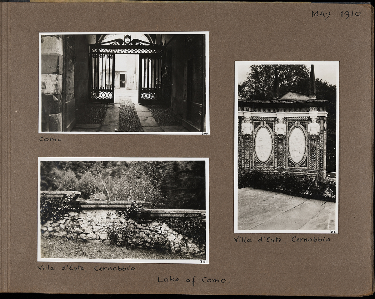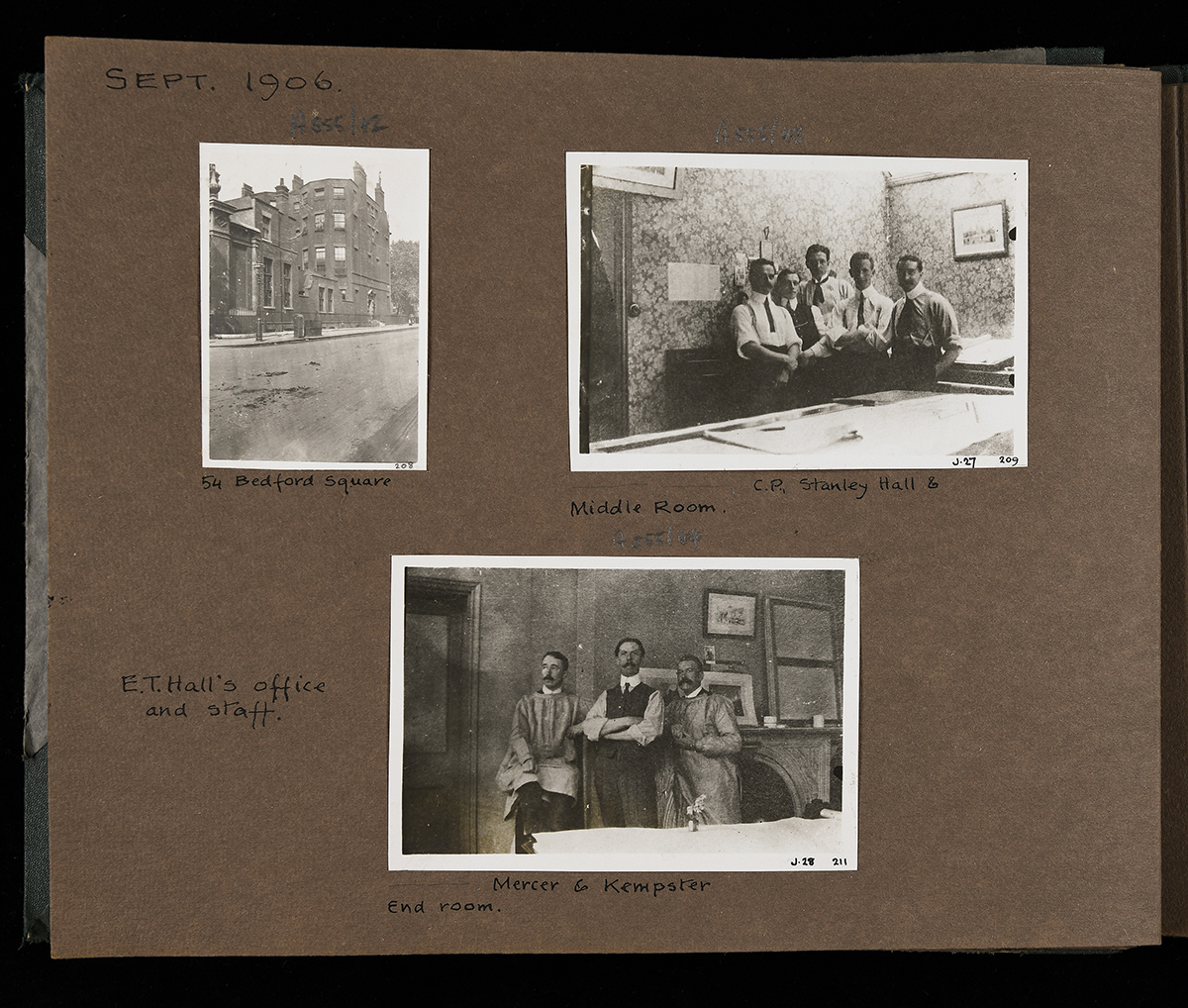 Nel settembre 1906, Cecil fotografò un edificio georgiano a 54 di Bedford Square, a pochi passi dal British Museum: era lo studio di Edwin Thomas Hall, una delle firme più autorevoli dell’architettura londinese, dove lavorava già da qualche anno, mentre frequentava la Royal Academy School. In una pagina dell’album fotografico compaiono alcuni giovani colleghi di Cecil in maniche di camicia, in posa, davanti a grandi tavoli da disegno. Si riconosce anche il titolare dello studio, immortalato con sguardo intenso e autoritario, affiancato dai soci Mercer e Kempster. Questi ultimi sembrano più rilassati e cordiali di Hall e indossano grembiuli da lavoro per proteggere i loro eleganti abiti dalle inevitabili macchie d’inchiostro. Cecil non appare nelle immagini, ma la sua presenza si percepisce dietro la macchina fotografica: in quella giornata settembrina, il giovane architetto voleva fissare volti e luoghi che avevano segnato l’inizio della sua carriera, mentre si preparava a partire per l’Italia.