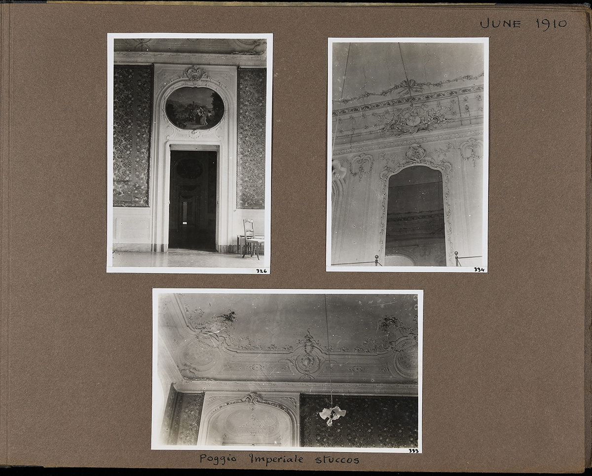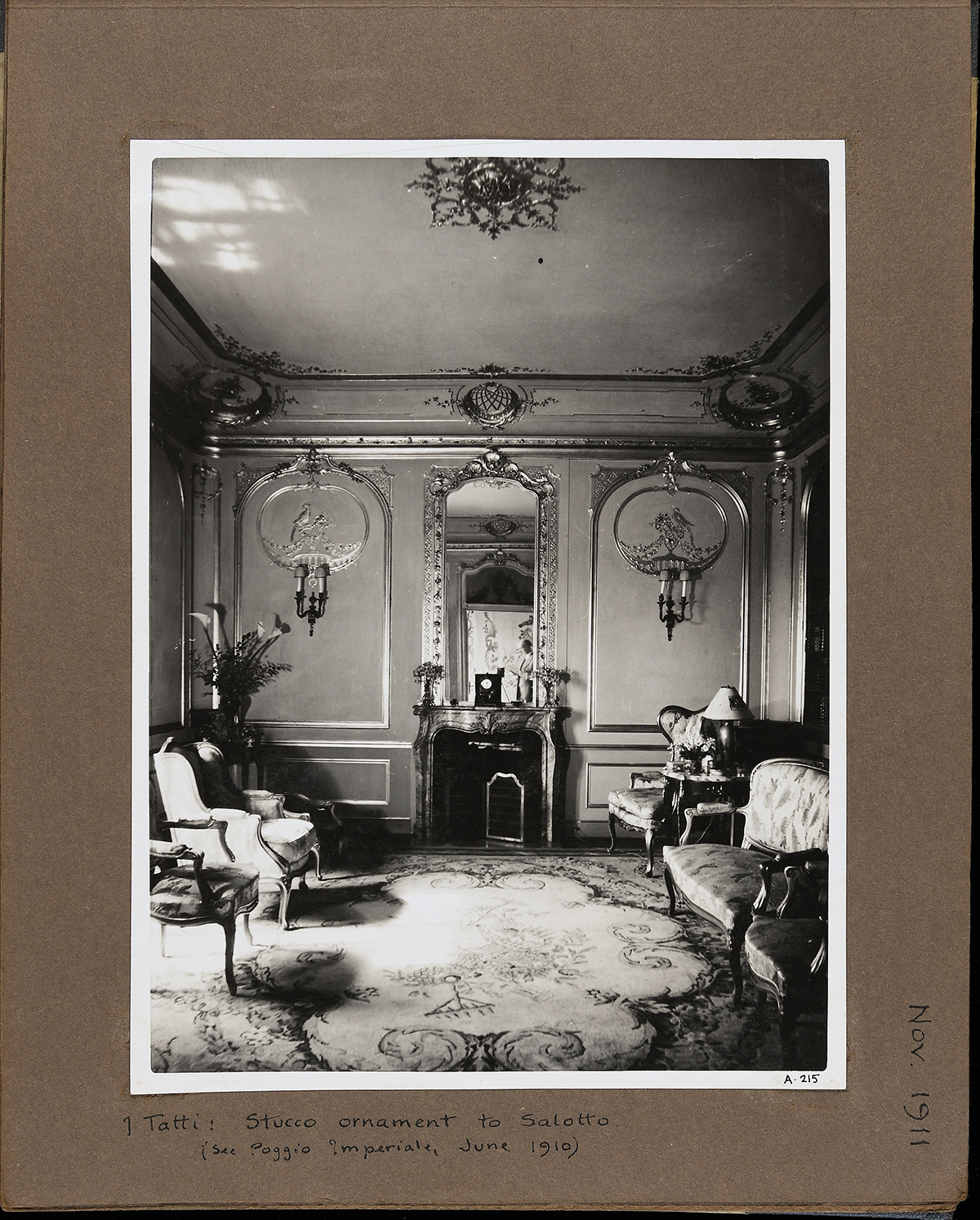Tra un sopralluogo e l’altro in cantiere, dunque, le notti di Cecil erano dedicate al disegno, nel tentativo di dare forma concreta ai desideri dei Berenson. Nelle lettere a Mary, sembra che i progetti a cui lavorava giorno e notte riguardassero soprattutto gli interni (la distribuzione degli ambienti, gli arredi e la decorazione) e il suo album fotografico documenta puntualmente l’esecuzione dei lavori. Particolarmente significativo è lo scatto del Salotto, accompagnato da una breve annotazione in cui Cecil dichiarava di essersi ispirato agli stucchi sette-ottocenteschi della Villa Medicea del Poggio Imperiale.