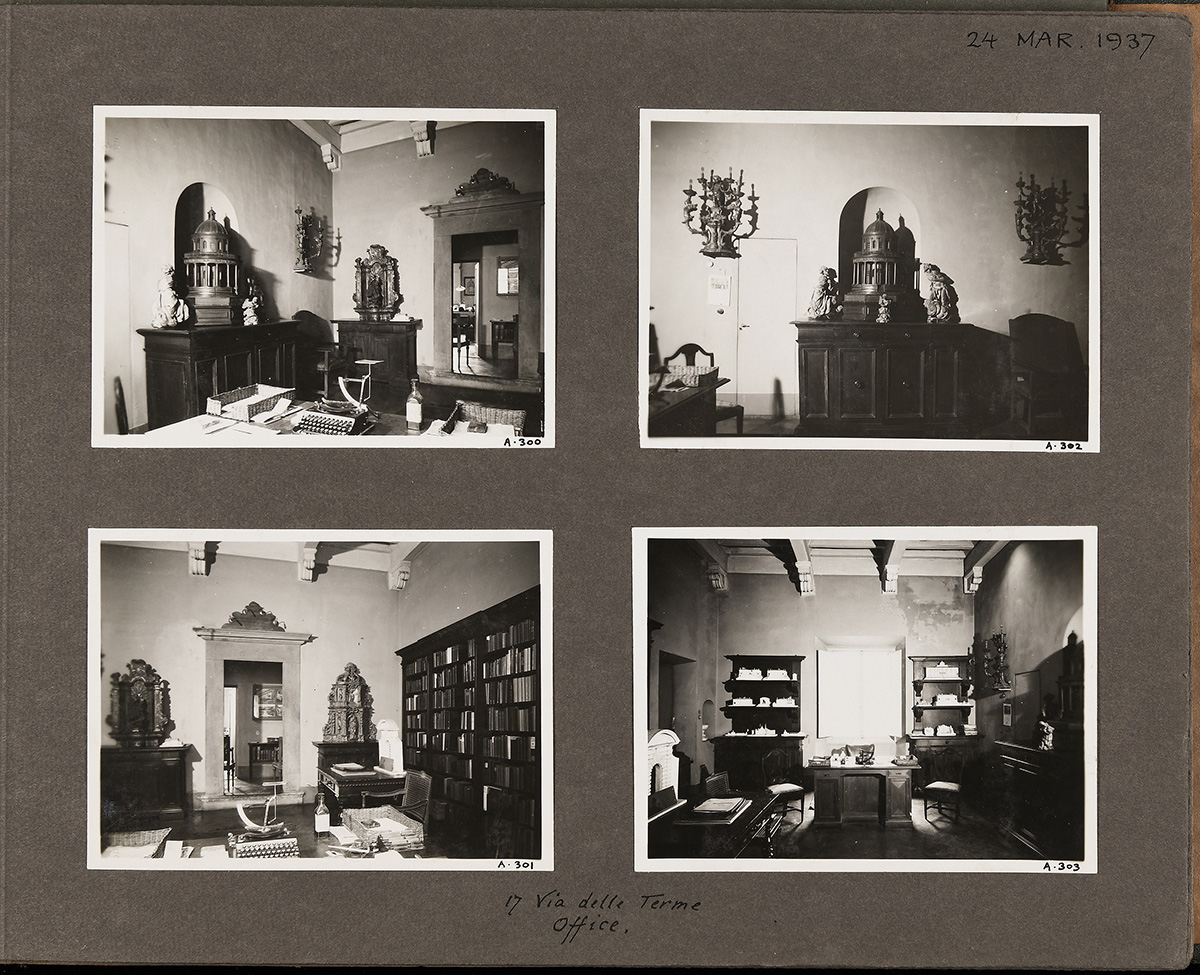 Alla vigilia dello scoppio della seconda guerra mondiale, Cecil decise di lasciare l’Italia e abbandonare la professione di architetto. Prima di partire, tuttavia, il 24 marzo 1937, fotografò l’appartamento in cui aveva vissuto per quasi vent’anni, in via delle Terme 37. Gli scatti dello studio restituiscono l’atmosfera di quel piccolo mondo dove passava le nottate al lavoro, come raccontava a Irene (Hull, CP, senza data – forse giugno 1914, da Hotel Manin, Milano). Si nota una scrivania, con una macchina da scrivere e un sestante, strumento che evidentemente utilizzava per effettuare rilevi accurati per siti di grandi dimensioni. Accanto, un modello in legno del Tempietto di San Pietro in Montorio di Bramante – simbolo dell’architettura rinascimentale italiana – affiancato da due piccole sculture in terracotta e una coppia di eccentrici candelieri barocchi. Sulla parete opposta, una libreria piena di libri, per lo più romanzi, come risulta dall’inventario che redasse qualche anno dopo, quando già si era trasferito in Inghilterra (RIBA Collections, Diaries). Alle spalle della scrivania si intravedono infine due credenze, con ripiani occupati da modelli architettonici in gesso o plastilina: plastici che Cecil realizzava con le sue mani, per presentare i progetti ai committenti.