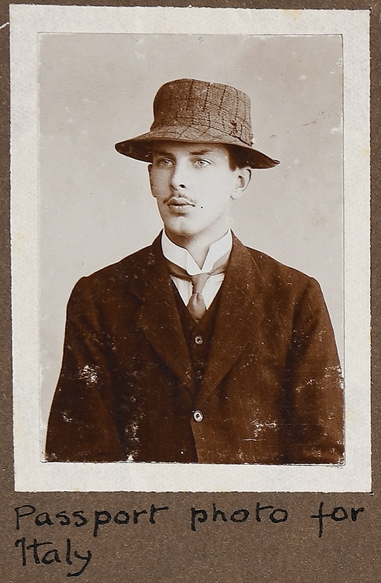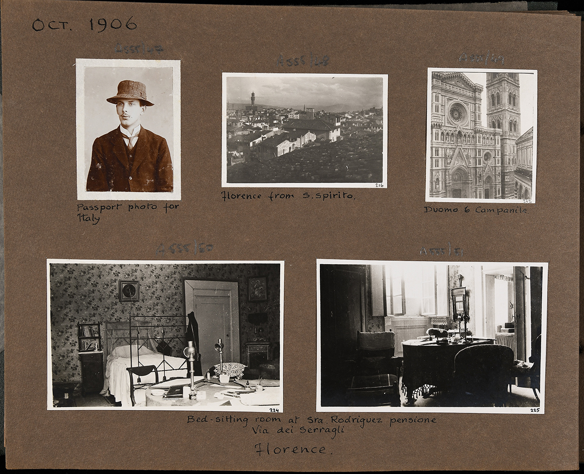Pochi mesi prima aveva vinto una prestigiosa borsa di studio – la Architectural Association’s Banister Fletcher Bursary – che gli avrebbe permesso di intraprendere il suo primo viaggio nella penisola, tappa fondamentale nella formazione di un architetto britannico dell’epoca. Nelle pagine successive, Cecil incollò la fotografia scattata per il passaporto. Nell’ottobre 1906 si trovava già a Firenze, ospite della pensione della signora Rodriguez in Via dei Serragli.