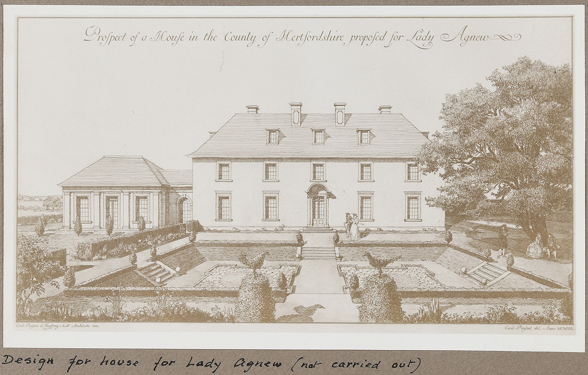 Nei due decenni precedenti, la sua attività professionale era stata intensa e svolta prevalentemente in Toscana per una clientela inglese e americana, legata al salotto culturale dei Berenson. Non mancarono, tuttavia, tentativi di ampliare il suo raggio d’azione. Nelle collezioni del RIBA Collections, ad esempio, si conserva il progetto per una country house nella contea inglese di Herfordshire, in un sobrio stile carolino (conosciuto anche “stile restaurazione”). Insieme a Geoffrey Scott, Cecil ne presentò una suggestiva raffigurazione ispirata alle incisioni inglesi del primo Settecento (come quelle celebri della Britannia Illustrata di Johannes Kip), popolando l’immagine di eleganti figure in abiti d’epoca, immerse in un piccolo giardino formale. In primo piano, si vedono anche due piante di tasso potate in forma di pavoni, evidente richiamo a all’arte topiaria dei giardini di Levens Hall. Il progetto riflette l’intento di reinterpretare con grazia e apparente disinvoltura la tradizione britannica, proprio come Cecil stava facendo in quegli stessi anni a Villa I Tatti, ispirandosi invece a modelli italiani.