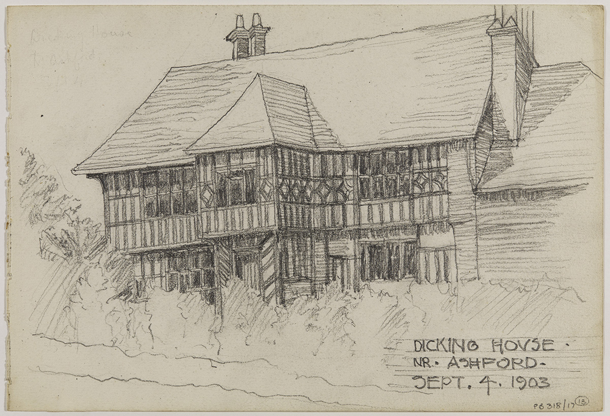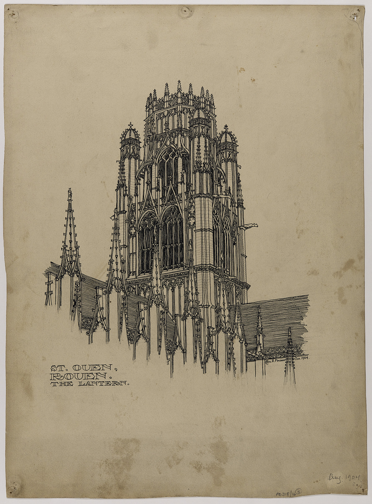 Non appena ne ebbe l’opportunità, Cecil tornò infatti nei luoghi visitati da ragazzo con il padre, per esercitarsi e mettere alla prova quanto appreso. Nell’agosto 1904 si trovava a Rouen, dove si dedicò al disegno dei dettagli decorativi della cattedrale di Notre-Dame. Dopo tre anni di apprendistato, il suo interesse per l’architettura gotica rimaneva immutato: le scuole inglesi dell’epoca erano ancora profondamente influenzate dagli scritti di John Ruskin e da un entusiasmo per l’arte medievale, idealizzata come espressione di un’etica superiore. Ruskin, così come molti architetti contemporanei a Pinsent, vedeva nelle grandi cattedrali del Duecento e del Trecento il risultato di una maestria artigianale vissuta con fervore quasi religioso, capace di generare edifici intrisi di spiritualità, in netta antitesi con la pratica architettonica moderna, fredda e impersonale. Non sorprende, quindi, che tra le sue mete privilegiate nei primi anni del Novecento figurino città come Warwick, Ely e Canterbury, custodi di straordinari esempi del tardo-gotico britannico. Tuttavia, non erano solo gli edifici monumentali ad affascinarlo: Cecil era attratto anche dalle architetture vernacolari, più semplici ma forse da lui percepite come più autentiche. Lo dimostrano fotografie e schizzi dedicati alle caratteristiche case a graticcio in legno, che rivelano un’attenzione per quel patrimonio costruttivo che, negli anni appena precedenti, aveva ispirato il movimento Arts and Crafts e influenzato l’opera di architetti come Philip Webb, Richard Norman Shaw e Edwin Lutyens.