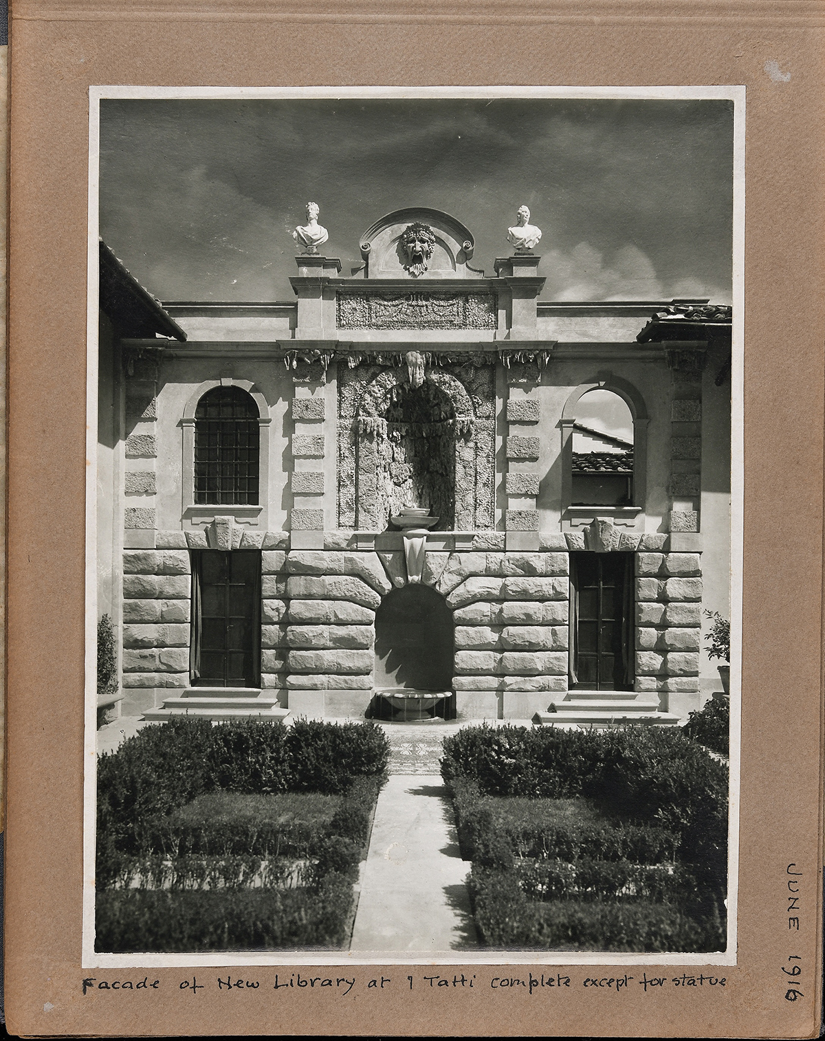 Il giardino di Villa I Tatti rappresenta un esempio emblematico di questa tendenza, pur rivelando, anche a un primo sguardo, la coesistenza di elementi tipicamente inglesi, con altri legati alla tradizione italiana – o quantomeno all’idea che ne avevano gli angloamericani dell’epoca. Inglesi sono lo stile dell’arte topiaria, la disposizione informale del fruit garden, il fitto bosco di aceri, pioppi e querce che circonda l’area formale e la presenza, assai abbondante, di rigogliose piante rampicanti. Italiane, invece, sono le terrazze, la geometria delle aiuole, la scelta delle specie arboree – in particolare i cipressi allineati lungo il viale a est della proprietà – e le numerose strutture architettoniche dal gusto neo-barocco progettate da Cecil. Notevoli sono le nicchie e le superfici murarie rivestite con mosaici di pietre spugnose e ciottoli, ispirate a esempi che l’architetto ebbe modo di osservare e fotografare durante i suoi viaggi, come quello che effettuò nel maggio 1910 a Villa d’Este a Cernobbio, in Lombardia.