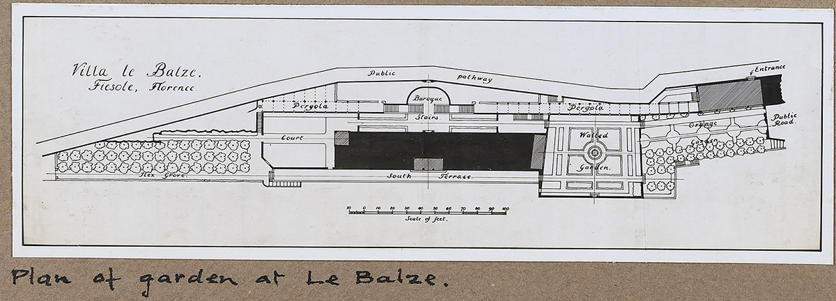 Tuttavia, l’opera per cui Pinsent è maggiormente ricordato è il giardino. In un primo momento, Mary ne aveva affidato la progettazione al pittore Aubrey Waterfield, nipote della scrittrice e studiosa Janet Ross, ma nel 1910 lo sollevò dall’incarico perché orientato verso un parco romantico all’inglese (“wild garden on English lines”) (Liserre 2008, 43). Un giardino di questo tipo era in contrasto con il gusto di Mary e molti angloamericani residenti sulle colline di Firenze, che preferivano giardini ispirati a modelli rinascimentali e barocchi italiani, in sintonia con lo stile delle loro case.