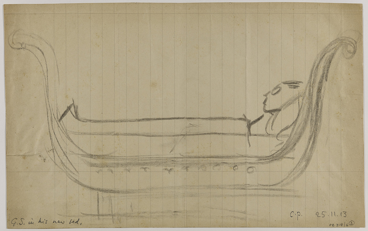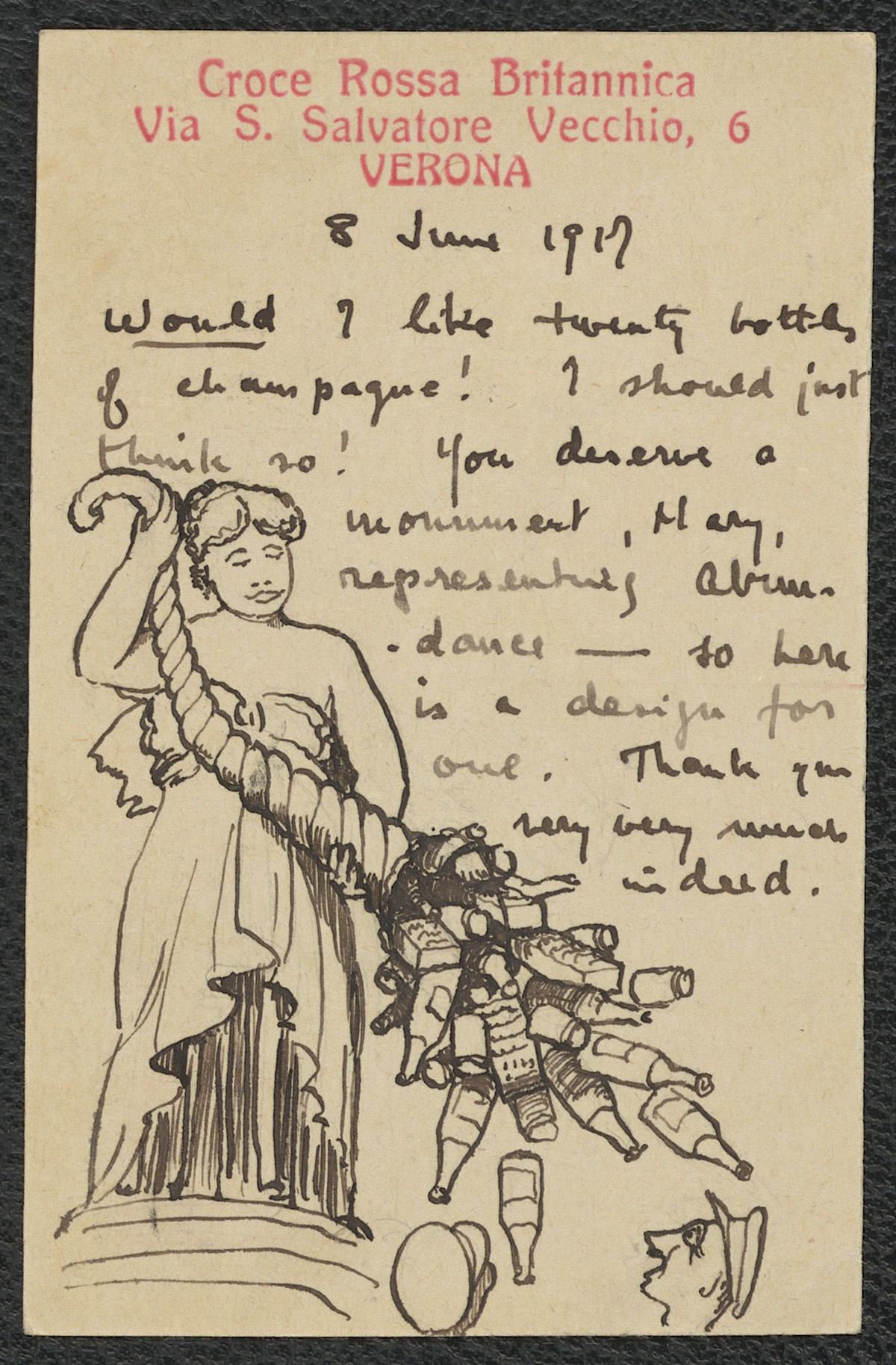 Anche Mary, da committente, si trasformò presto in confidente di entrambi, come lascia intuire la fitta corrispondenza conservata negli archivi di Villa I Tatti. In alcune lettere inviate da Cecil durante la prima guerra mondiale, si apprende che fu proprio lei ad aiutarlo a evitare il fronte, offrendogli sia sostegno morale che supporto materiale. In una simpatica missiva dell’8 giugno 1917, Pinsent la ritrasse in un disegno come la personificazione classica dell’Abbondanza, mentre lui osserva estasiato le bottiglie di champagne e le barrette di cioccolato che sgorgano dalla sua cornucopia (I Tatti, CP, 8 giugno 1917).