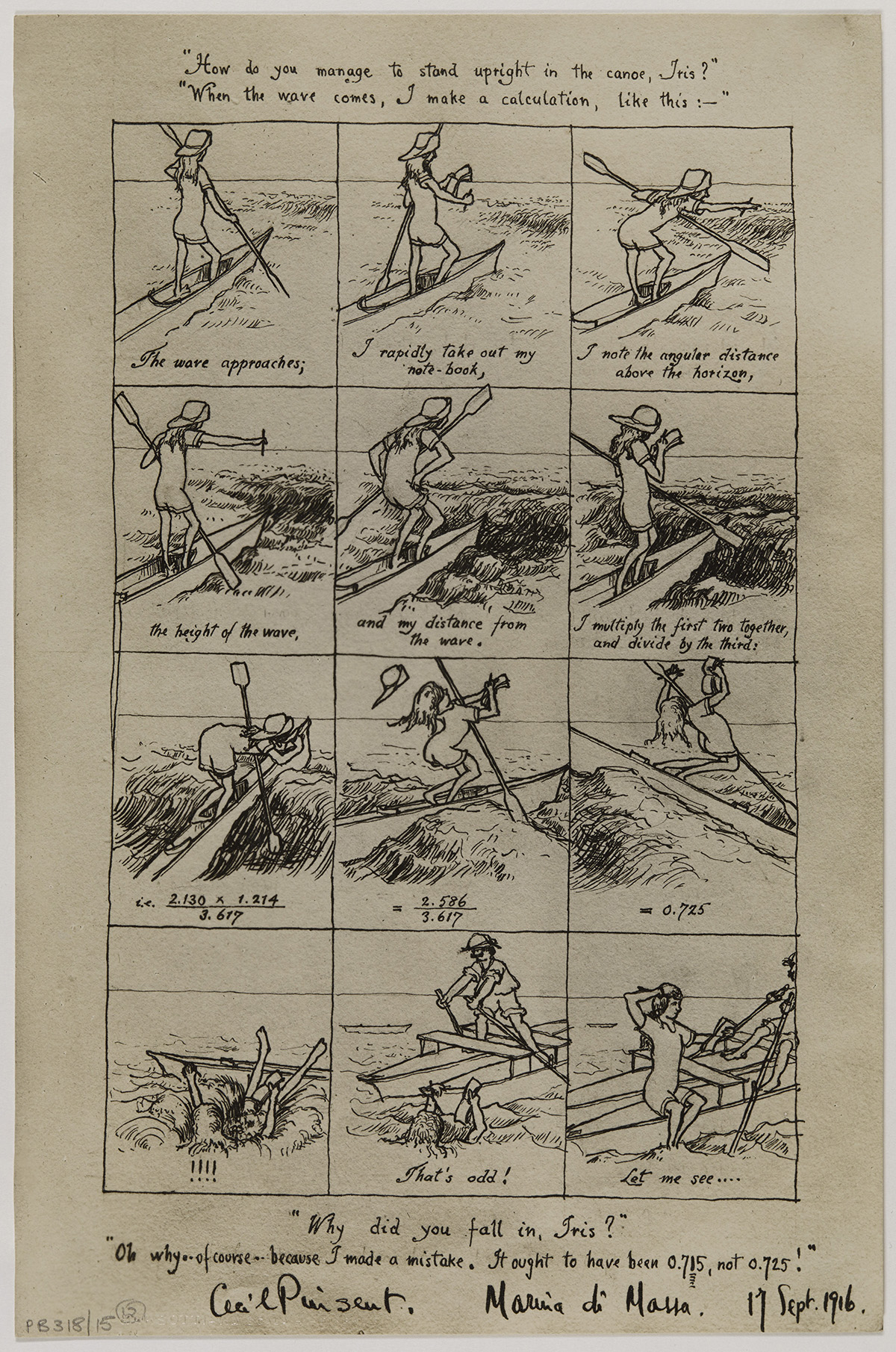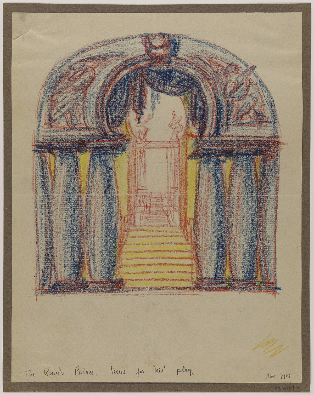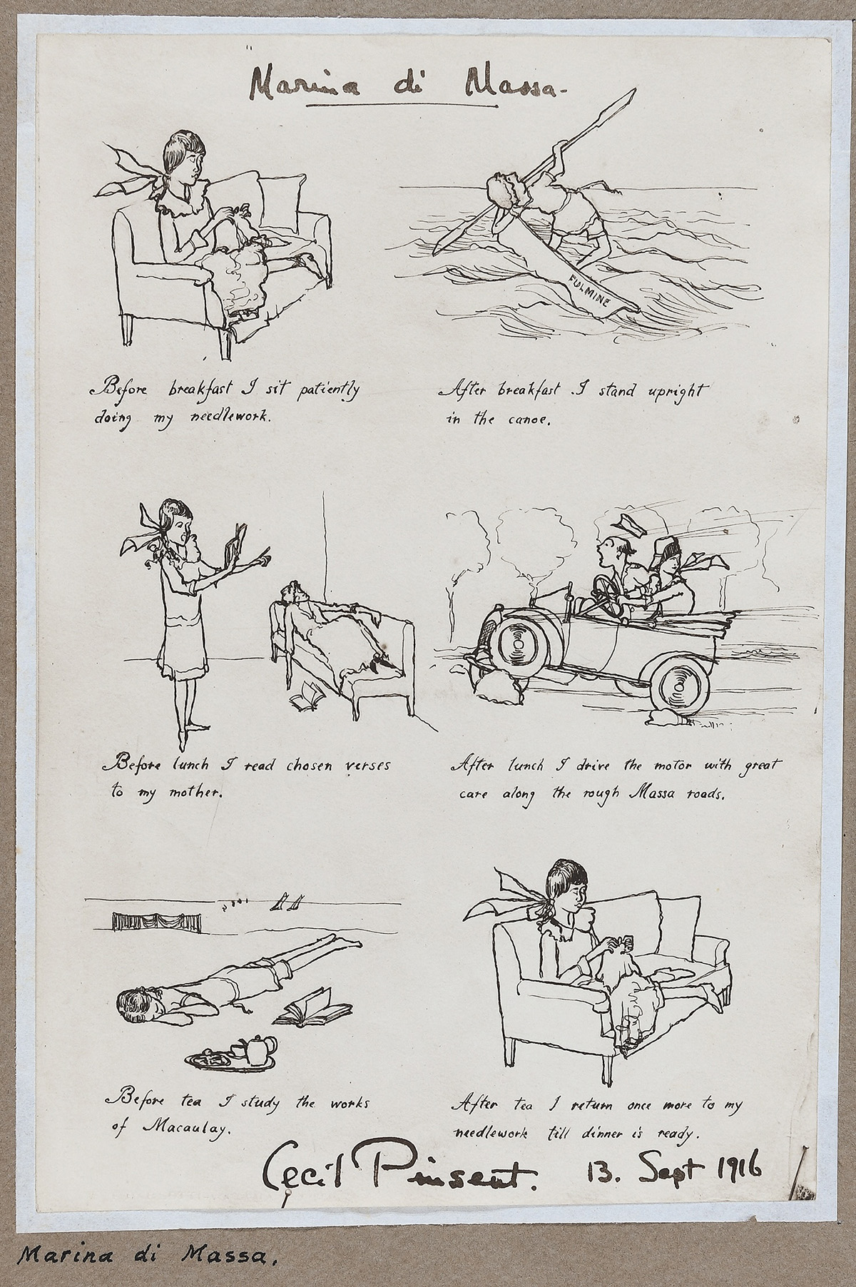 Nel frattempo, Pinsent sviluppò legami profondi con alcuni dei suoi committenti fiorentini. Tra questi, una posizione particolare è occupata Iris Cutting (1902-1988), figlia della proprietaria di Villa Medici a Fiesole, Sybil Cutting, che affidò a Cecil il compito di rinnovare il giardino e progettare gli arredi di alcune stanze. Ben presto l’architetto divenne ospite fisso della villa e compagno di viaggio insostituibile per tutta la famiglia. Due vignette ironiche, conservate nella collezione del RIBA, raccontano il legame strettissimo instaurato con la giovane Iris, allora quattordicenne, durante una vacanza a Marina di Massa: la ritraggono mentre lavora a maglia, si avventura in canoa, legge poesie alla madre e guida spericolatamente per le strade della Toscana. Per lei, Cecil ideò anche la scenografia per uno piccolo spettacolo teatrale – forse scritto dalla stessa Iris – ambientato in un immaginario “Palazzo Reale”: ne resta traccia in un disegno a matite colorate, datato 1914, dove Cecil diede forma a un’ambientazione onirica e fiabesca, in sintonia con l’indole sognante della giovane Iris.
