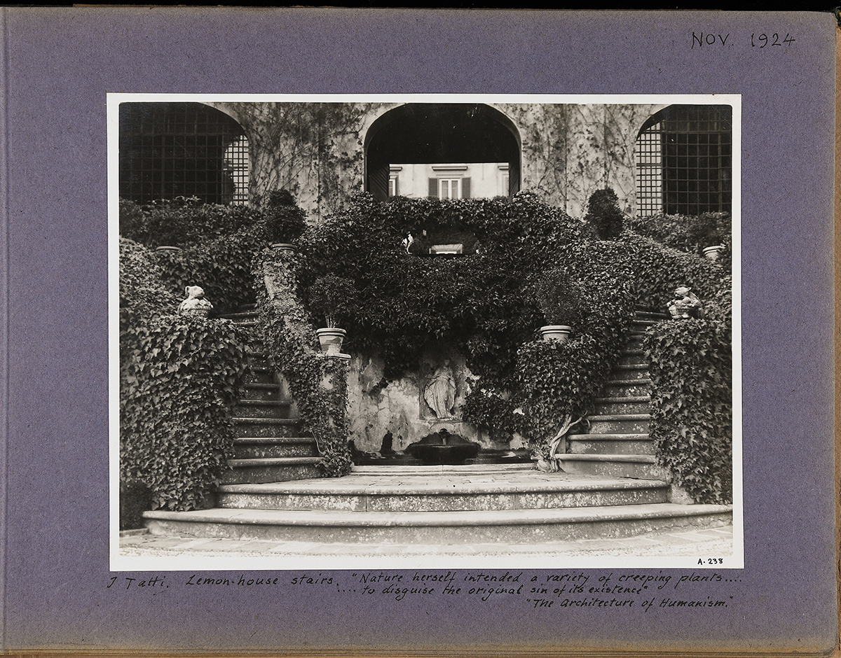 Questa originale sintesi incontrò grande favore nella cerchia dei Berenson e ben presto altri anglo-americani chiesero a Cecil di restaurare le loro residenze e progettare nuovi giardini formali ispirati a modelli italiani del passato. Anche se Geoffrey Scott non ebbe un ruolo operativo nei cantieri, come emerge dalla corrispondenza con Mary Berenson, rimase per Pinsent un importante punto di riferimento intellettuale. Questo legame affiora anche in una fotografia delle scale della limonaia di Villa I Tatti, dove Cecil trascrisse un poetico passaggio, tratto da The Architecture of Humanism di Scott: “La natura stessa ha voluto che una varietà di piante rampicanti mascherasse il peccato originale della sua esistenza”.