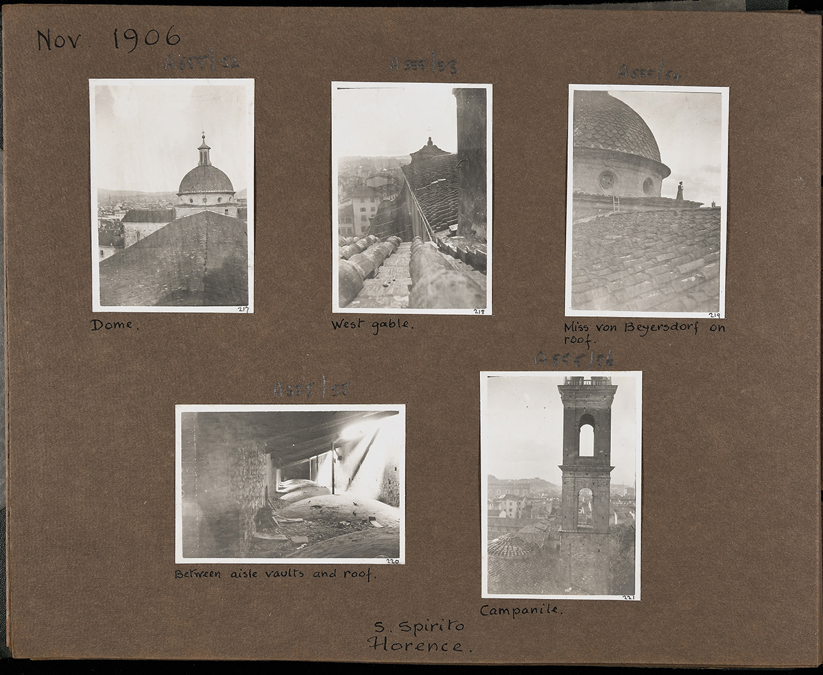 Durante le sue esplorazioni, riuscì persino a salire sul tetto della chiesa di Santo Spirito, un’esperienza che lo colpì profondamente. Con la sua macchina fotografica, immortalò ciò che lo circondava: un’amica in abiti vittoriani accanto alla cupola, le ampie vedute della città, incorniciate dai coppi, ma anche dettagli più tecnici, catturati con cura e attenzione. Tra questi, una fotografia del sottotetto della chiesa con le volte brunelleschiane rivela molto del suo approccio all’architettura: Cecil non si limitava ad appezzare aspetti superficiali, ma era interessato a comprendere a fondo la logica statica e costruttiva dei capolavori dell’architettura rinascimentale che aveva l’opportunità di osservare e studiare a Firenze. Di lì a pochi anni, sarebbe proprio stata la pratica di cantiere, il contatto diretto con il lavoro delle maestranze, a coinvolgerlo ed entusiasmarlo sempre di più.
