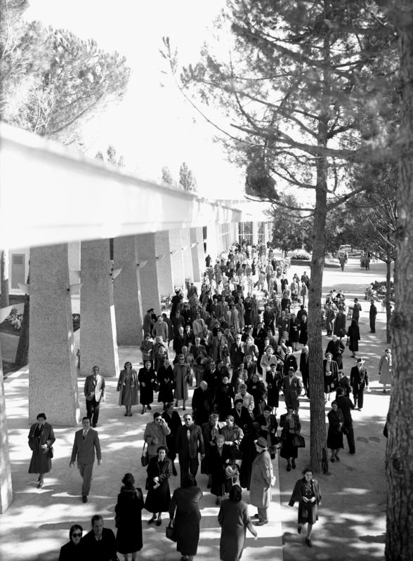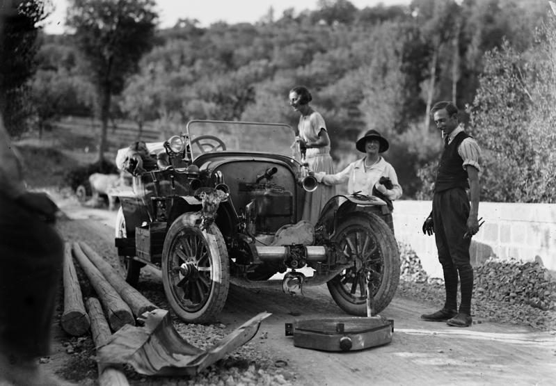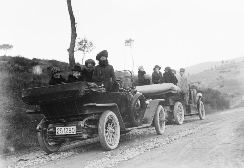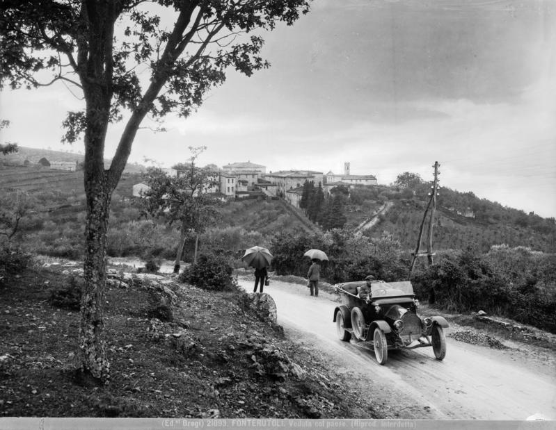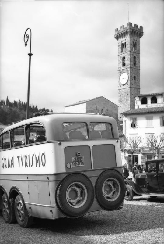 La selezione di immagini relative al tema del turismo (Figg. 10-13) illustra l’evoluzione delle pratiche turistiche nel contesto specifico della Toscana centrale, documentando una trasformazione che va dal fenomeno della gita domenicale nelle campagne del Chianti, inizialmente circoscritto alle famiglie borghesi, fino alle prime forme di turismo di massa alle Terme di Chianciano. Particolare attenzione è rivolta, inoltre, ai cambiamenti dei mezzi di trasporto utilizzati – tra cui le automobili, la Vespa, i primi pulmini dei viaggi organizzati – che hanno progressivamente plasmato un territorio, creando nuove dinamiche e geografie della mobilità declinate in veri e propri “paesaggi di transito” (Löfgren, 2001): spazi territoriali ridefiniti dalla logica del movimento e dell’attraversamento turistico, dove infrastrutture, servizi e paesaggio stesso si adattano per accogliere e facilitare i flussi di visitatori.