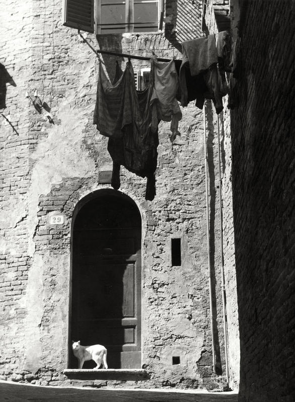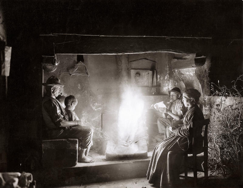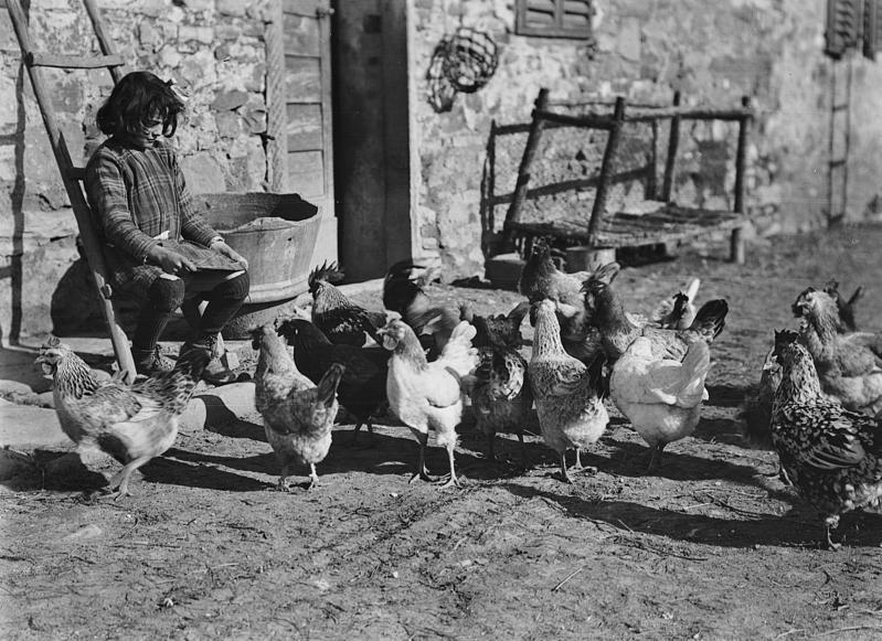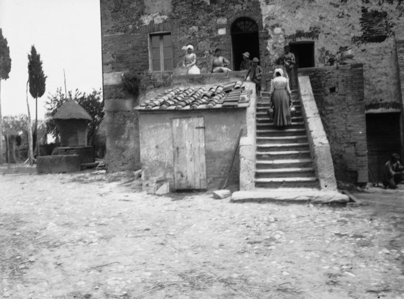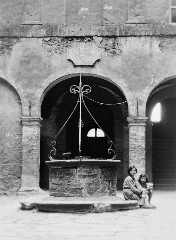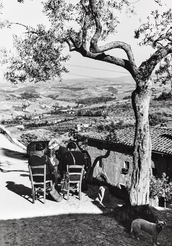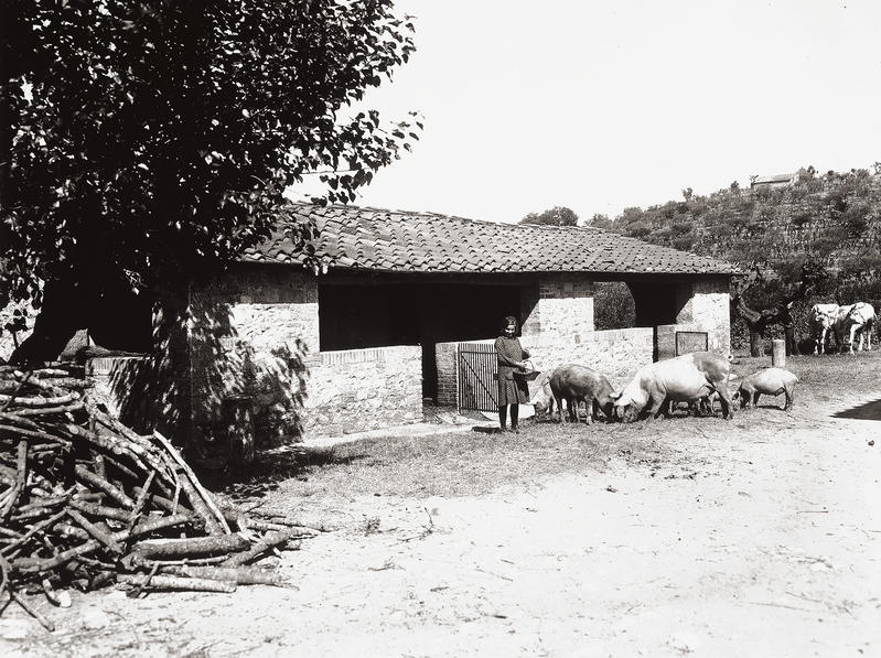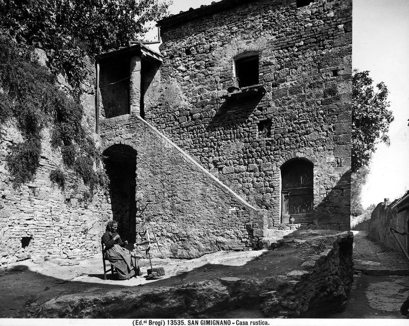 Le fotografie di questo terzo nucleo tematico documentano le tipologie delle dimore coloniche caratteristiche della Toscana mezzadrile (Figg. 29-31) e le scene di vita quotidiana che le animavano (Figg. 32; 50-51). In un celebre studio pubblicato nel 1936, l’antropologo Giuseppe Pagano e l’architetto Guarniero Daniel utilizzarono la documentazione fotografica per mappare il patrimonio culturale rurale italiano, identificando alcuni elementi comuni. In particolare, nell’area centrale della penisola, la Toscana mostrava abitazioni rurali di due tipologie: a monoblocco, che nelle loro origini erano torri di avvistamento, con la parte abitativa al piano superiore cui spesso si accedeva tramite scale esterne, come nelle fotografie Una donna che fila la lana all’arcolaio, seduta di fronte ad una casa rustica, in una strada di San Gimignano (Fig. 29) e Casa colonica nella campagna del Chianti (Fig. 30) oppure a più corpi, tendenzialmente due: la sezione abitativa e quella destinata alla stalla o alla porcilaia. Questa disposizione degli edifici a “L” generava uno spazio condiviso, che diveniva dunque luogo di lavoro e fatica, ma anche di quotidianità, dove si alimentavano relazioni e scambi. Uno spazio di incontro e di definizione dei ruoli tanto lavorativi quanto sociali tra uomini e donne, anziani e giovani. Ciò viene testimoniato da queste stesse immagini: l’aia nell’epoca mezzadrile era luogo di produzione, di svago, ma soprattutto delle relazioni quotidiane. Relazioni che spesso erano forzate. Va ricordato infatti che la famiglia mezzadrile era poli-nucleare, ossia composta da più nuclei coniugali riuniti in un gruppo domestico lavorativo solidaristico, e che in questo sistema di comunità domestica, che serviva essenzialmente per la gestione del podere, non sempre si sceglieva con chi relazionarsi, anzi si finiva insieme per necessità. Come suggerisce l’antropologo Pier Giorgio Solinas (2004: 107): «Magari all’epoca era vissuta come una condanna, oggi forse è vissuta quasi con nostalgia, per quel senso di communitas che creava».