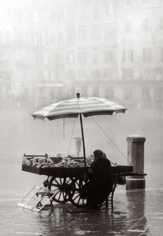 26. Autore non identificato, Venditrice ambulante in Piazza del Campo in un giorno di pioggia, Siena. Cartolina inviata dall’autore a Vincenzo Balocchi, 1930 ca., cartolina, 10,5 x 14,5, Archivi Alinari-archivio Balocchi, Firenze, BVA-F-004062-0000.