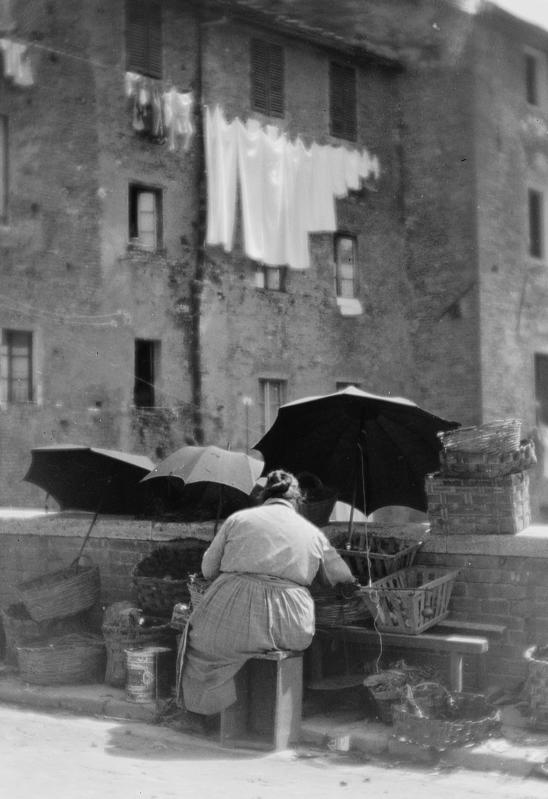 Come mostrano altre fotografie di questa sezione (Figg. 26-28), se da una parte il commercio del bestiame era un’attività riservata agli uomini, la vendita dei prodotti della campagna costituiva un affare prevalentemente femminile. Le donne delle famiglie contadine avevano infatti un ruolo fondamentale nella gestione non solo della casa e dei figli, ma anche dei prodotti agricoli e manifatturieri, dell’orto e degli animali da cortile. Mentre gli uomini erano occupati nei campi nel lavoro finalizzato alla rendita del podere, le donne andavano al mercato per vendere frutta, ortaggi, pollame e uova, contribuendo al guadagno della famiglia.