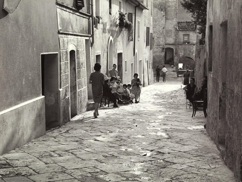Le immagini degli Archivi Alinari selezionate per questa mostra restituiscono non solo l’aspetto fisico dei luoghi, ma anche i gesti quotidiani e le relazioni sociali che animavano quegli spazi, permettendo di osservare come i cambiamenti tecnologici, economici e sociali siano inscritti nel territorio. Assumendo dunque il pensiero di Sereni e la visione di Lorenzetti come fili conduttori di questa narrazione visiva, l’intento è stato quello di documentare la storia di profonda intimità tra uomo e territorio abitato, la storia della nascita e della trasformazione dei paesaggi, tanto rurali quanto urbani, compresi entrambi come esiti e presupposti dell’attività e dei vissuti. L’obiettivo non è stato solo quello di ricostruire un quadro storico, ma anche quello di comprendere come questi paesaggi siano stati vissuti, trasformati, abitati, come le pratiche quotidiane abbiano modellato i territori e come i territori abbiano a loro volta influenzato le pratiche sociali. E in questo contesto la fotografia, in qualità di “lente” per indagare il valore e il senso, ci ha permesso non tanto di circoscrivere quanto di allargare il contesto: conservando memorie e testimoniando il divenire.