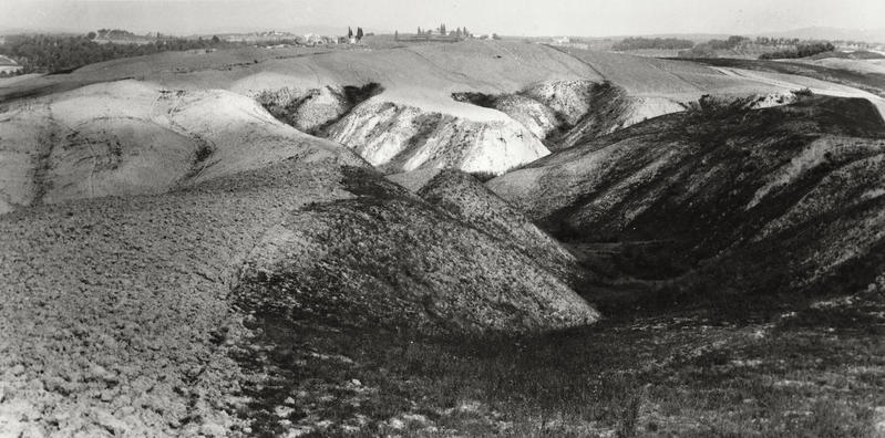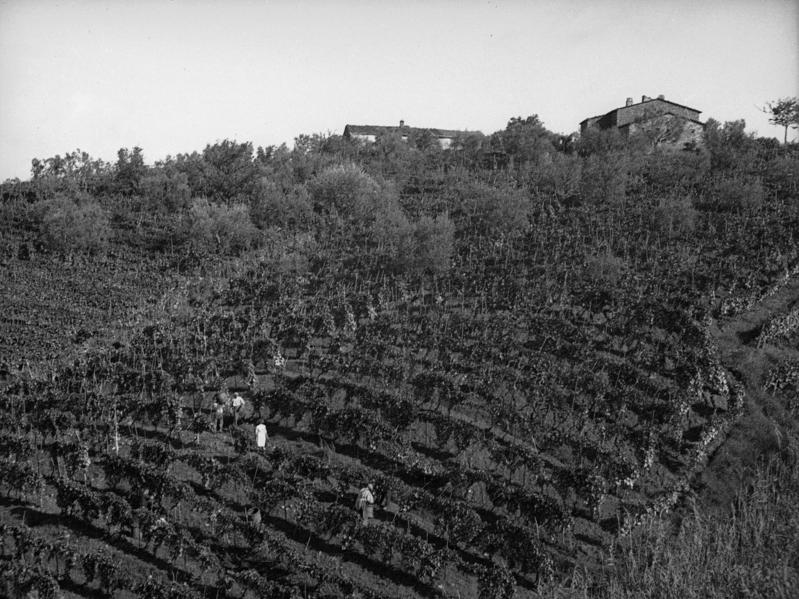 Il primo segmento tematico si è concentrato sulle pratiche agricole, e in particolare su quelle produzioni fondamentali – cereali, vino, olio e allevamento, in special modo dei suini – che connotano il territorio. Attraverso le fotografie selezionate si evidenziano le trasformazioni tanto nella gestione paesaggistica quanto nelle tecnologie e negli strumenti produttivi dall’aratro al trattore (Figg. 1-8). Un elemento determinante è rappresentato dalle sistemazioni idraulico-agrarie: modelli di gestione territoriale concepiti per assicurare l’equilibrio ottimale tra caratteristiche del suolo e regime delle acque al fine di garantire rese produttive soddisfacenti. Negli anni Cinquanta, il geografo francese Henri Desplanques (1959) catalogò queste tecniche nelle colline dell’Italia centrale, distinguendo essenzialmente due tipologie: quelle che si adattano alla morfologia naturale del terreno e quelle che la rimodellano integralmente. Nel primo insieme si colloca il rittochino, dove i filari discendono linearmente dalla sommità al fondovalle seguendo la massima pendenza. Vi sono poi il cavalcapoggio e il girapoggio, quest’ultimo osservabile nella fotografia Veduta di vigneti (Fig. 6), che prevedono una sistemazione “per traverso” che asseconda approssimativamente le curve di livello del terreno. Le sistemazioni denominate ciglionamenti e terrazzamenti, più complesse rispetto a quelle precedentemente menzionate e in realtà note fin dal Neolitico, hanno costituito invece una vera rivoluzione paesaggistica, consentendo la coltivazione di versanti anche molto ripidi attraverso una necessaria trasformazione dell’aspetto collinare. L’Accademia dei Georgofili, istituita nel 1753, ebbe un ruolo determinante nella diffusione di questi metodi in Toscana. Qui, agronomi come Cosimo Ridolfi – nobile fiorentino considerato tra i fondatori dell’agronomia italiana – elaborarono tecniche sempre più raffinate, che trasformarono la campagna toscana in un laboratorio a cielo aperto fino agli anni Cinquanta del Novecento.